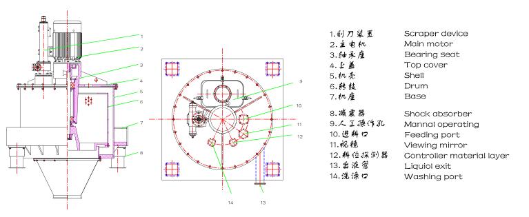 氮气保护系统、机械式料位探测器、PLC程序控制、液压控制系统、气体辅助刮刀、无基础形式(配置隔振底盘+减振器),按用户所分离物料的防腐要求采用相应的不锈钢材料、衬塑等(SUS304、32、316L、904L、双相不锈钢、钛材等)。